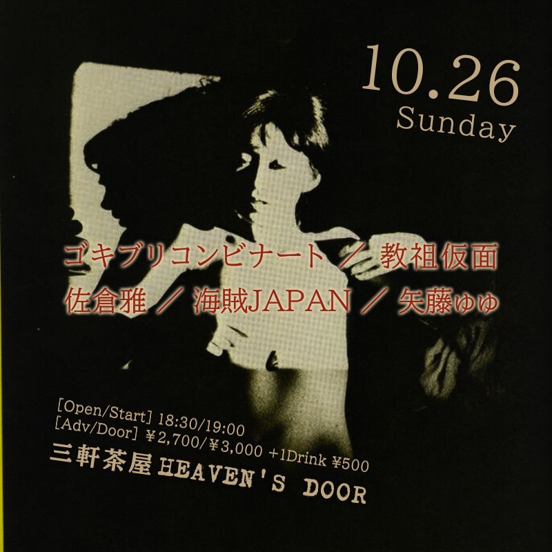 10/26 三茶ヘブンスドアにてライブの予定があります。久しぶりにミニミュージカルをやるつもりです! beyond underground ゴキブリコンビナート / 教祖仮面 / 佐倉雅 / 海賊JAPAN / 矢藤ゅゅ 前売/当日 ¥2,700/¥3,000 open/start 18:30/19:00 三... -