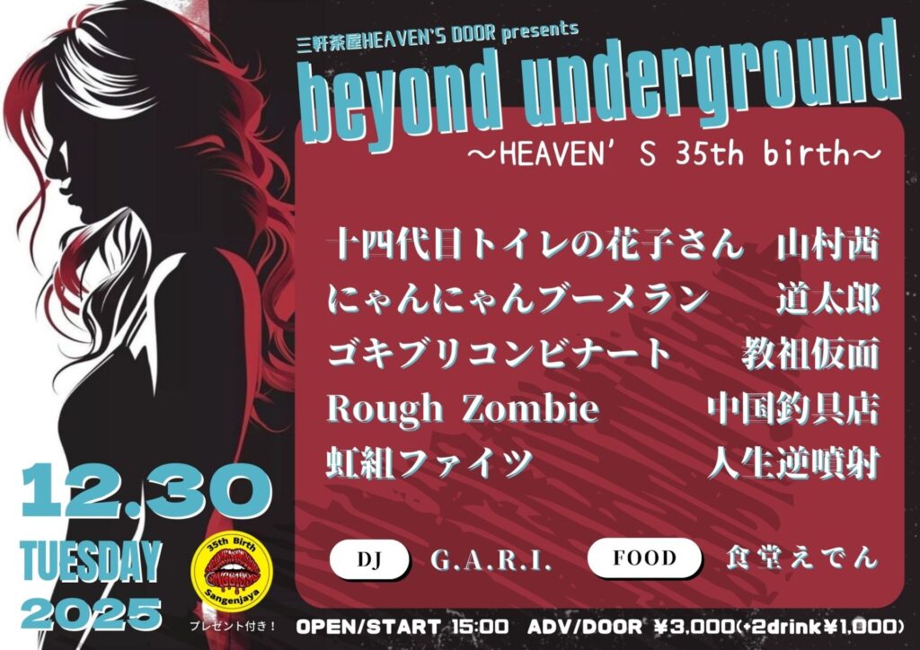 beyond underground ~HEAVEN’S 35th birth~ 十四代目トイレの花子さん / 虹組ファイツ / 人生逆噴射 / 中国釣具店 / Rough Zombie /教祖仮面 / 道太郎/ 山村茜 / ゴキブリコンビナート / にゃんにゃんブーメラン DJ:G.A.R.I. FOOD:食堂えでん... -
