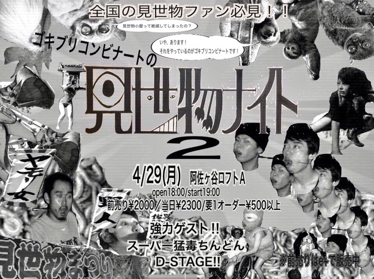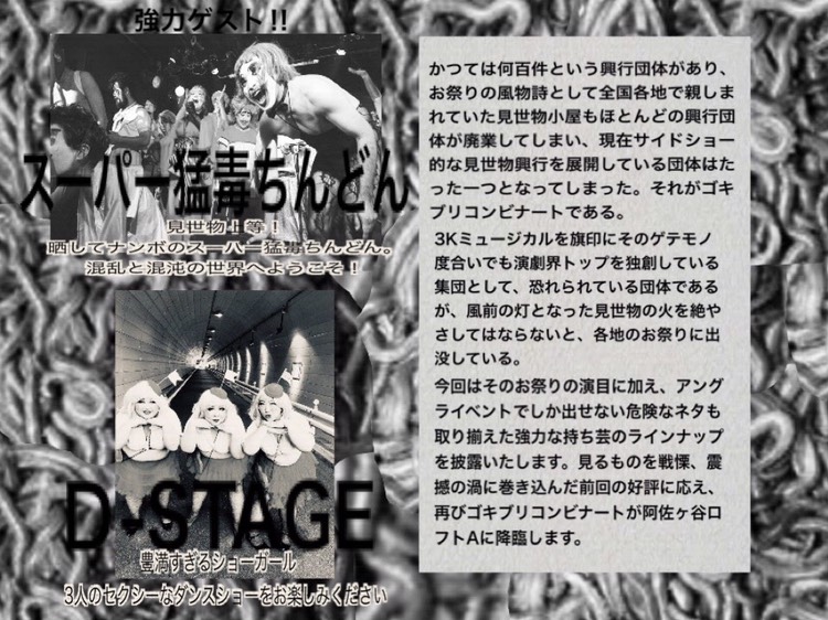 かつてはお祭りの風物詩として幾団体もあった見世物興行団体だが、現在サイドショー的内容で勝負し続けている団体はゴキブリコンビナートが唯一となってしまった。日本の演劇界ではゲテモノ度NO.1として孤高のポジションに君臨している劇団でもある。そんなゴキブリコンビナートが会場を阿鼻叫喚地獄に陥れた前回の好評に答え、また阿佐ヶ谷ロフトAにやって来る。子どもたちも楽しめる通常営業の見世物芸に加え、お祭りではヤバくてやれないネタも用意して全力で臨む。また、D−Stage、スーパー猛毒ちんどんという見世物性たっぷりなゲストも加わり、「見世物」という言葉を聞いて少しでも胸躍るところがある方は、必見のイベント。