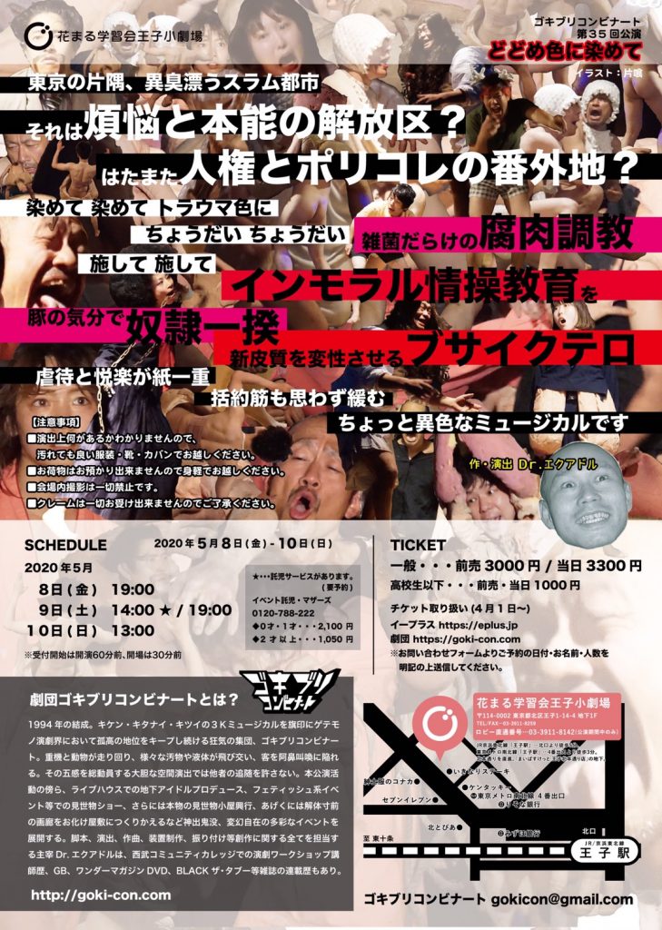本公演中止のお知らせ 2020 4/20 2020年2月15日2020年4月20日 花まる王子小劇場にて5月8日より予定されておりましたゴキブリコンビナート本公演「どどめ色に染めて」は、新型コロナウイルスのリスクを鑑み、中止を決定させていただきました。スケジュールを調整された方、期待を持ってお待ちいただいた方、誠に申し訳ありません。 返金等の手続きはお手数ですが、各種プレイガイド等にてお願いいたします。 お知らせ この記事が気に入ったら フォローしてね! Follow @gokiburikonbina よかったらシェアしてね! URLをコピーしました! URLをコピーしました! 1月24日 三茶ヘブンズドアにてミニミュージカル コロナ企画第3弾!過去公演を配信! 関連記事 本公演参加者募集 2026年3月28日 5月31日 三軒茶屋ヘブンスドアにてライブ 2026年3月26日 10月18日〜21日 本公演 2026年3月26日 12月30日三軒茶屋ヘブンスドアにてライブ 2025年12月21日 1/10 早稲田ZONE-Bにてライブ 2025年12月8日 マザリのツアーに部分的に参加します。 2025年11月7日 11/23 タイニーウルトラ(我修院達子)生誕祭に参加します。 2025年9月23日 10/26 三茶ヘブンスドアにてライブ 2025年9月23日