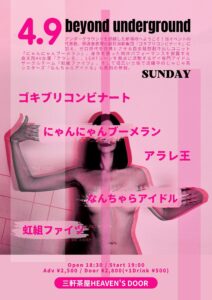アンダーグラウンドを超越した新境地へようこそ!当イベントの代表格、極過激表現の最狂演劇集団『ゴキブリコンビナート』に加え、ゼロ世代を彷彿とさせる自由発想剥き出しユニット『にゃんにゃんブーメラン』、身体を張った肉体パフォーマンスを披露する奇天烈AV女優『アラレ王』、LGBTシーンを拠点に活動するゲイ専門アイドルサークルチーム『虹組ファイツ』、そして幅広い土俵で活躍中のじゃじゃ馬シスターズ『なんちゃらアイドル』も異例の参戦です!