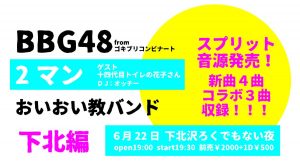BBG48vsおいおい教バンド企画第6弾!!! スプリット音源発売!新曲4曲コラボ3曲収録!! ゲストは、出禁系アイドル妖怪!十四代目トイレの花子さん!! 全出演者、殺害塩化ビニールのレーベルメイト!!